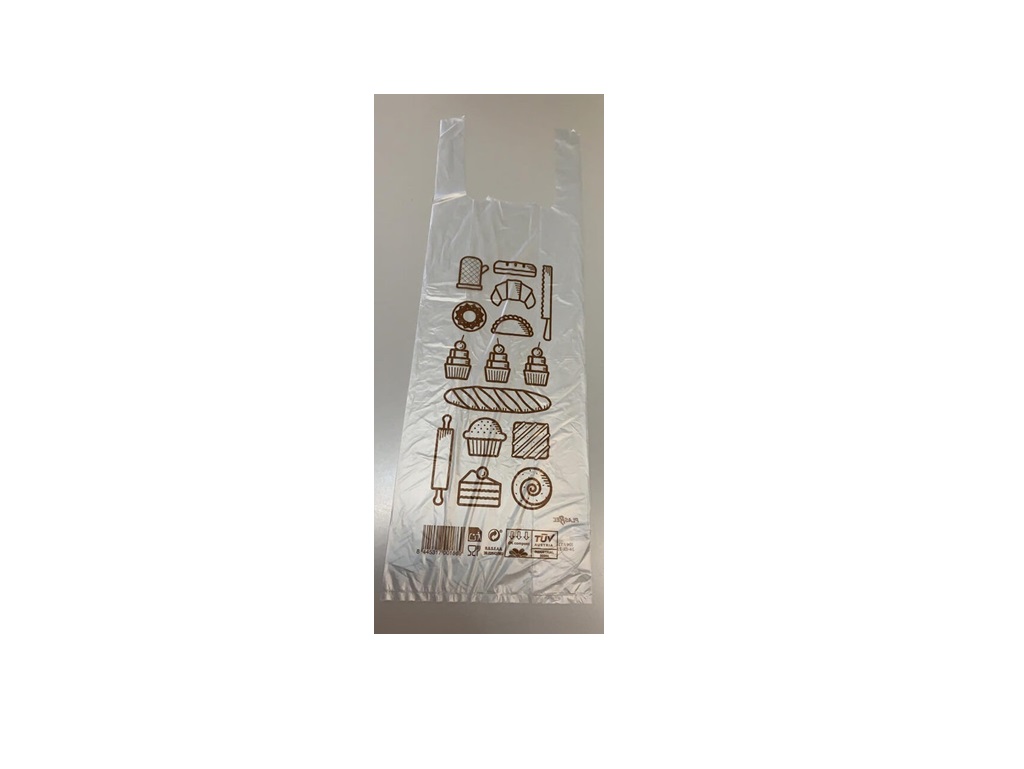 Bolsa de plástico para barras de pan biodegradables y compostables. Las bolsas se sirven impresas con motivo de panaderia y con asas tipo camiseta.