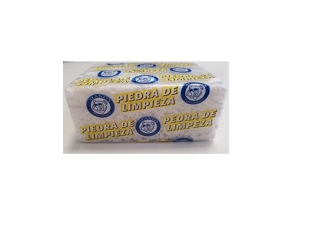 Piedra de limpieza o piedra pomez, fabricada en vidrio celular con alto poder desincrustante, arrastra la suciedad más rebelde y la grasa incrustada. Usar sola o con su limpiador habitual. Medidas: 9,5×7,5×4,5 cm. Presentación en caja de 12 unidades envasadas individualmente. Es un producto especial para limpiar planchas o superficies con grasa o suciedad incrustrada dificil de limpiar.
